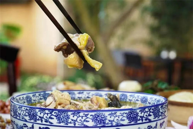 除了炒菜外,这里的炖土鸡汤也是一绝,还未上桌就远远闻到鲜美的鸡汤味道,据谭师傅介绍,这里的土鸡汤,以土鸡做主食材,生姜、草果为辅料,文火慢炖制成,鸡肉口感筋道,鸡汤醇香浓厚。