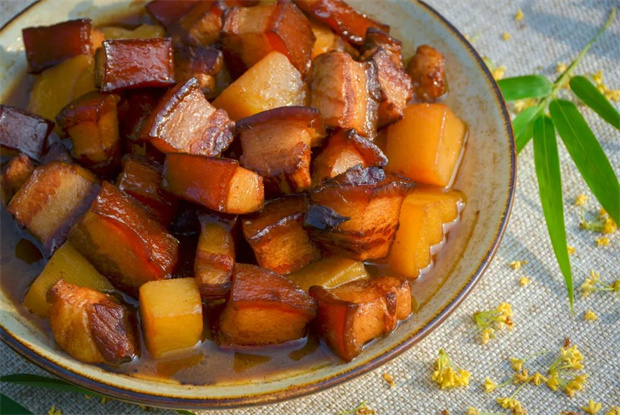另一边散发着香辣味道的菜品是“黄焖鸭”,也是这里另一道深受食客欢迎的名菜。原料用的是本地散养的老鸭,灵活擅跑,肉质十分紧实,以黄焖烹制最为美味。制作时用大火将肉色炒至微黄,再焖一个小时左右出锅味道最佳。