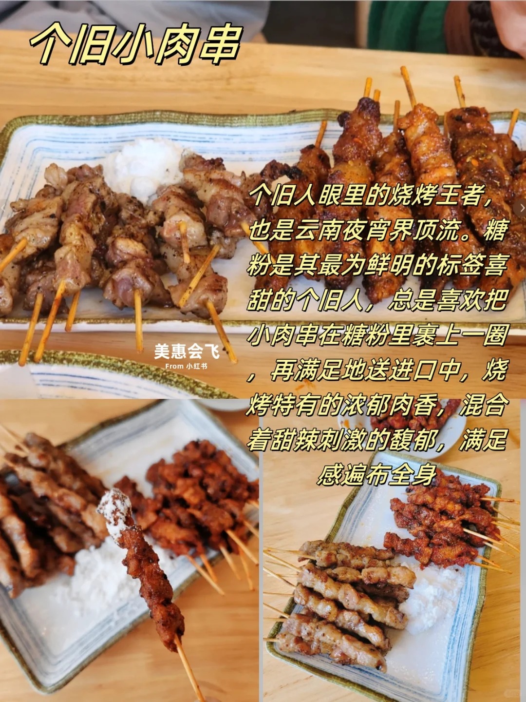 2.个旧小肉串:个旧人眼里的烧烤王者,喜甜的个旧人,总是喜欢把小肉串在糖粉里裹上一圈,再满足地送进口中,烧烤特有的浓郁肉香,混合着甜辣刺激的馥郁。十分满足。