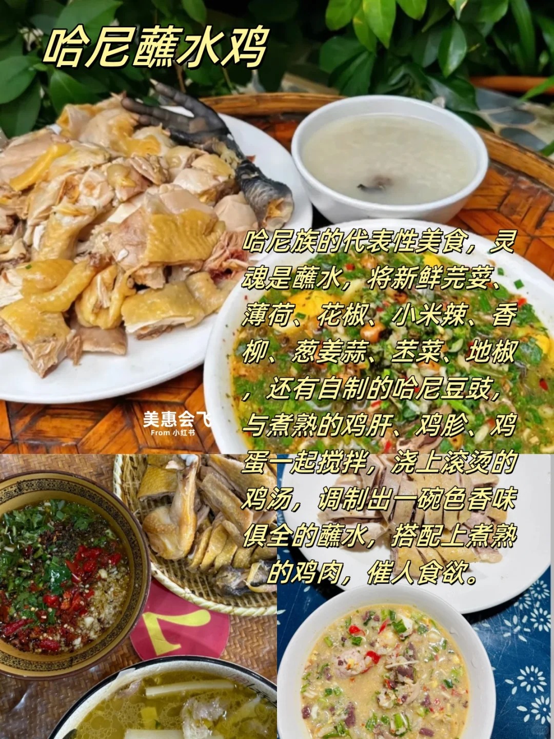 3.哈尼蘸水鸡:哈尼族的代表性美食,灵魂是蘸水,将新鲜芫荽、薄荷、花椒、小米辣、香柳、葱姜蒜、苤菜、地椒,