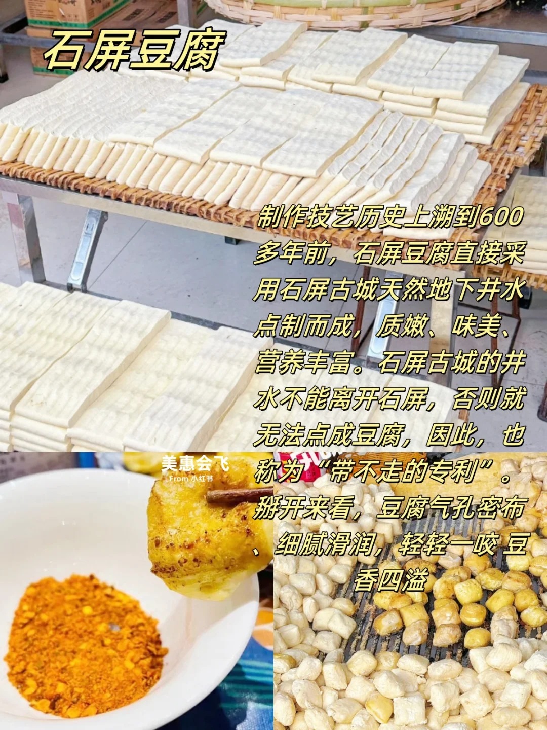 更奇妙的是石屏古城的井水不能离开石屏,否则就无法点成豆腐,也称为“带不走的专利”。掰开豆腐气孔密布、细腻滑润,轻轻一咬 豆香四溢