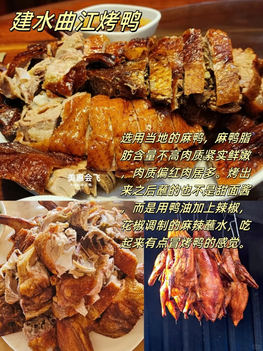 7.建水曲江烤鸭:选用当地的麻鸭,麻鸭脂肪含量不高肉质紧实鲜嫩,肉质偏红肉居多。烤出来之后蘸的也不是甜面酱,而是用鸭油加上辣椒,花椒调制的麻辣蘸水,吃起来有点冒烤鸭的感觉。