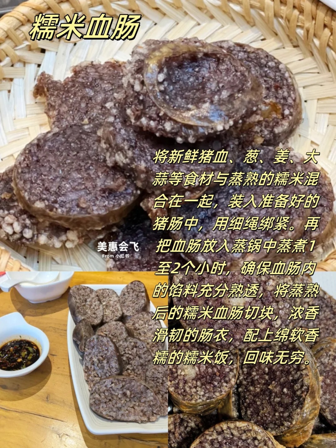再把血肠放入蒸锅中蒸煮1至2个小时,。将蒸熟后的糯米血肠切块,便可食用。浓香滑韧的肠衣,配上绵软香糯的糯米饭,回味无穷。