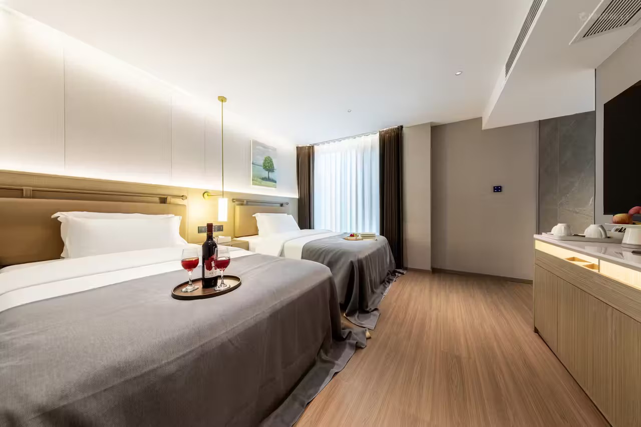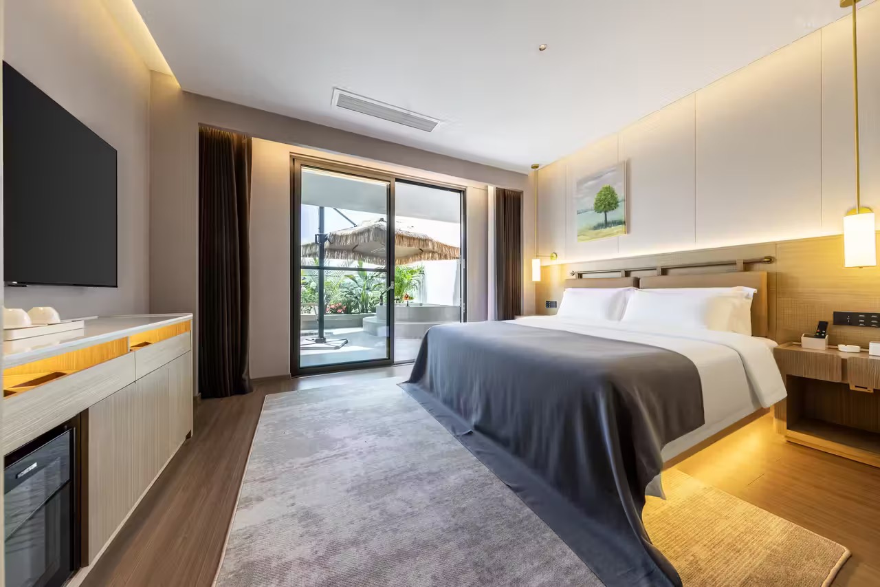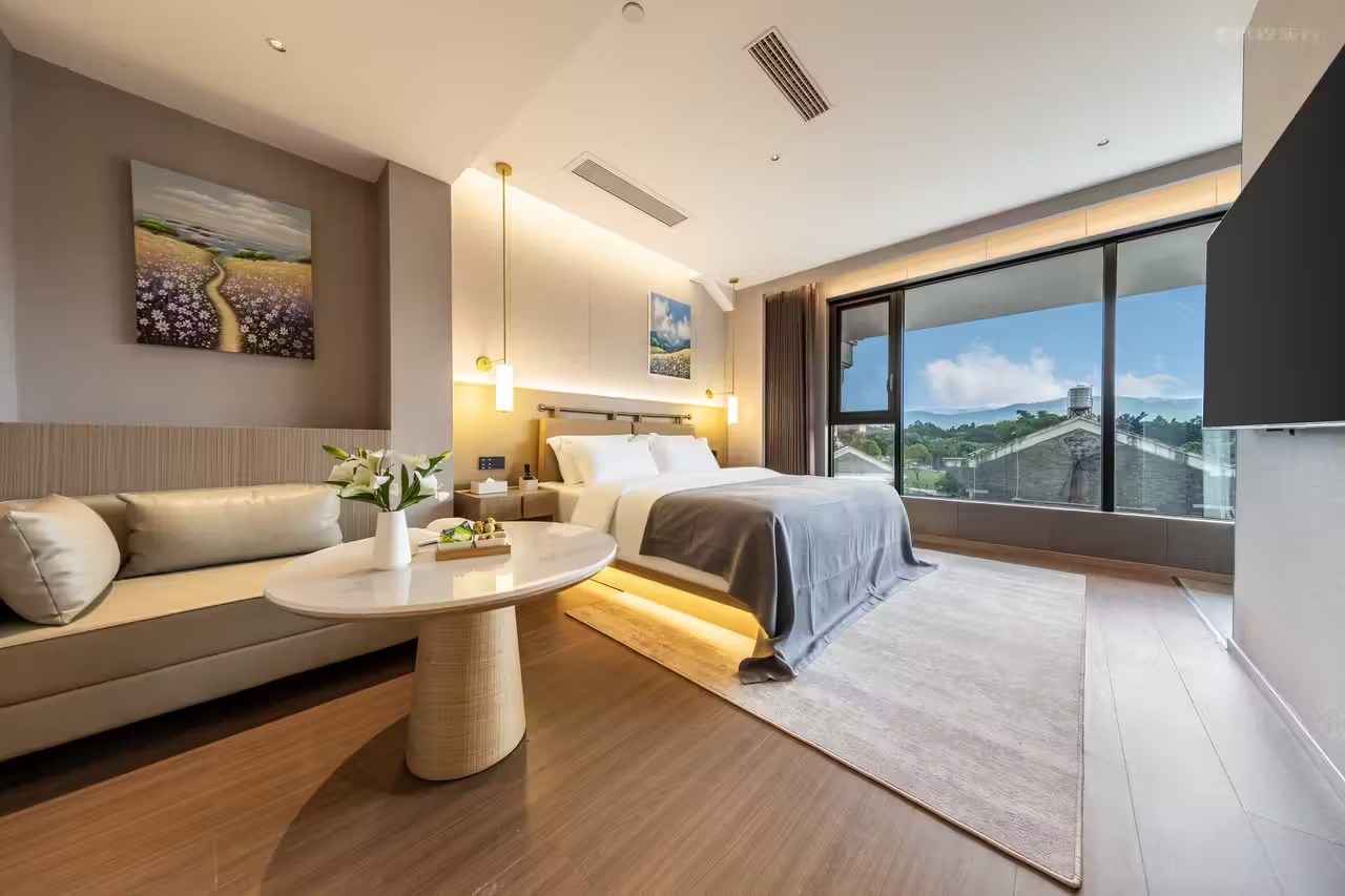 酒店拥有114间温馨客房,90%的房型配备私汤泡池,涵盖多元需求。房型包括雅致双床房、景观私汤亲子房、私汤观影大床房等,部分房型带花园或阳台,可边泡汤边赏湖景、山景甚至远眺弥勒佛。