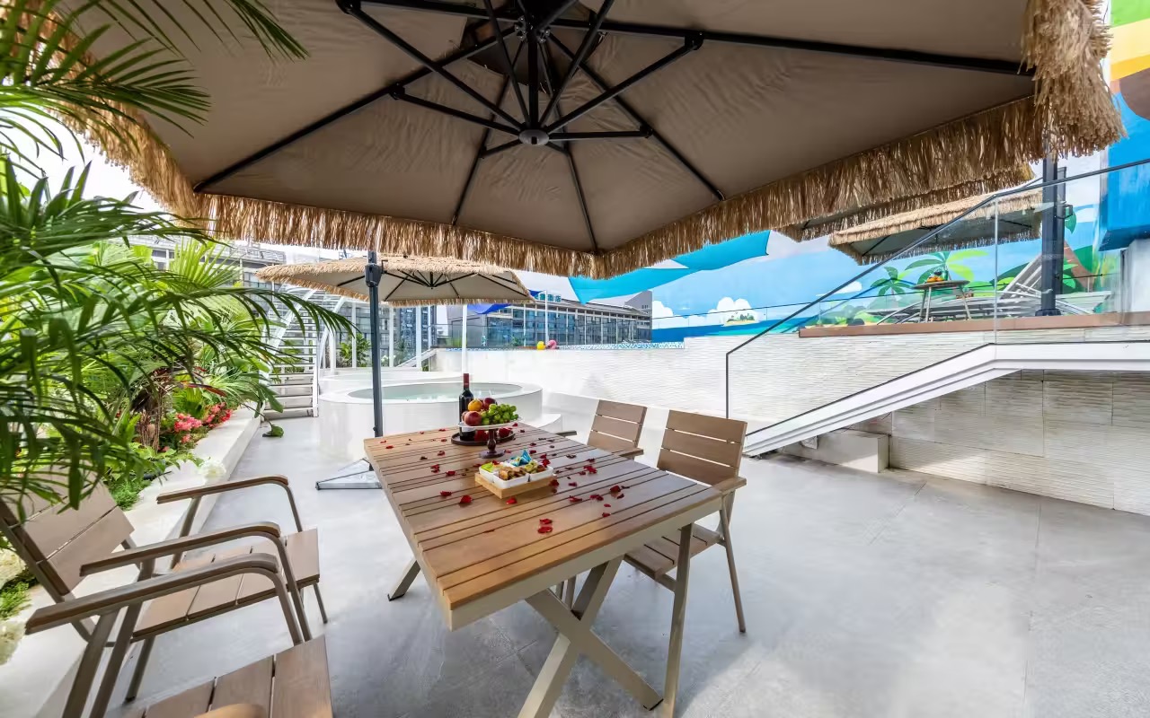 私汤泡池注入富含十余种矿物质微量元素的天然温泉水,搭配天窗或阳台设计,兼具私密性与观景体验,日落时分泡汤更具氛围感。