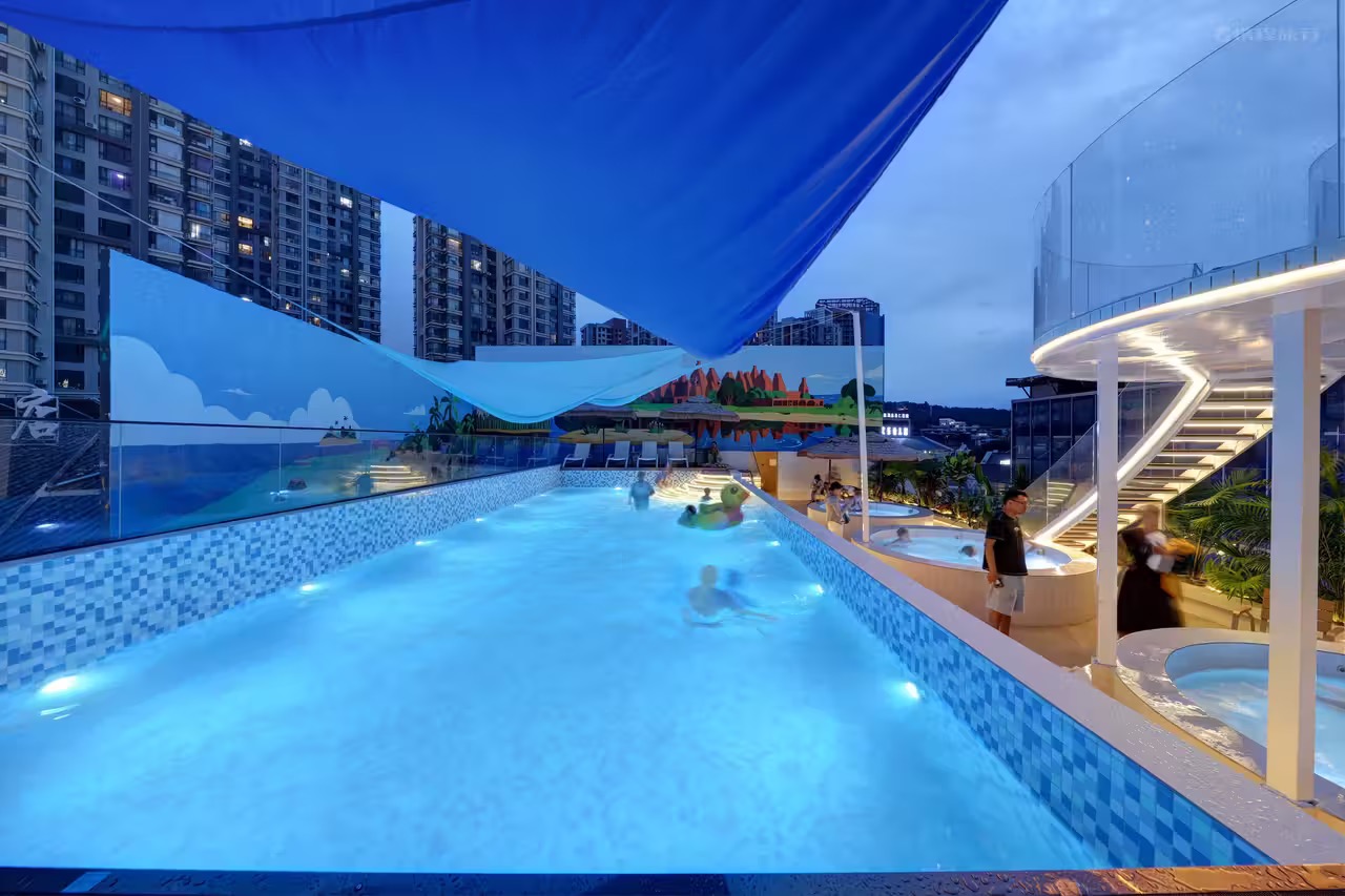 一楼设有舒适休闲区,衔接温泉与泳池区域,动线设计合理;各楼层走廊宽敞明亮,搭配景观窗引入自然光线与户外景致。