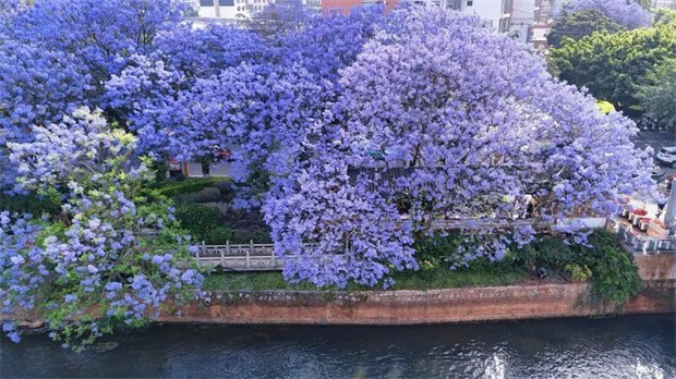 蒙自尼苏小镇的蓝紫色梦幻长廊不容错过,蓝花楹沿着大屯海边盛放,航拍视角下美得令人震撼。南湖公园道路两旁的