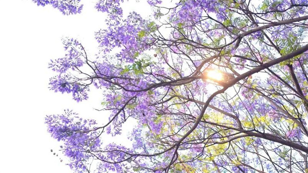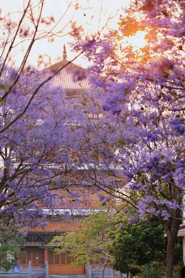 蓝花楹,是更唯美的视觉暴击,阳光穿透半透明花瓣,碧蓝的湖水映衬着蓝紫色花朵,诗意而清新。