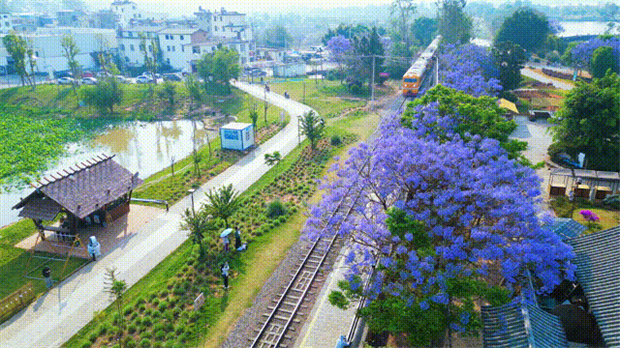 建水蓝花楹也悄然盛开,微风吹过,紫色花串随风摇曳。乘着建水古城橘黄色的小火车,穿过清香稻田,窗外是蓝紫色